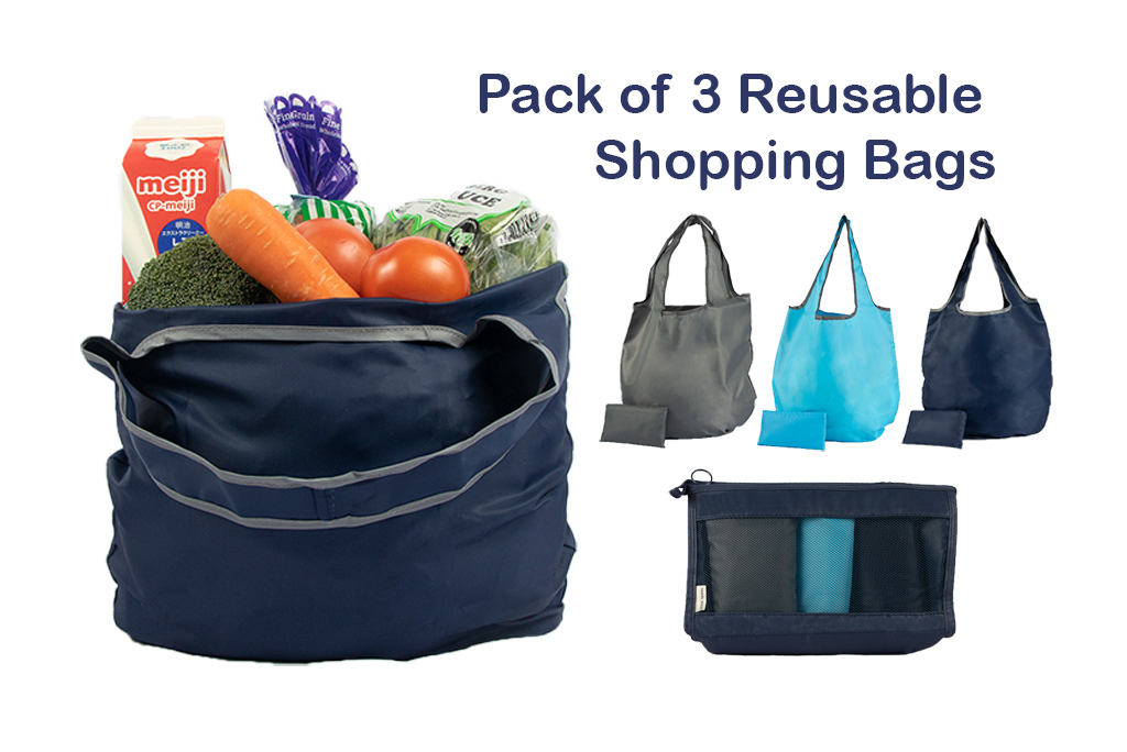Pack of 3 Reusable Grocery Shopping Bags Inside a Zipper Pouch, SHOP NOW